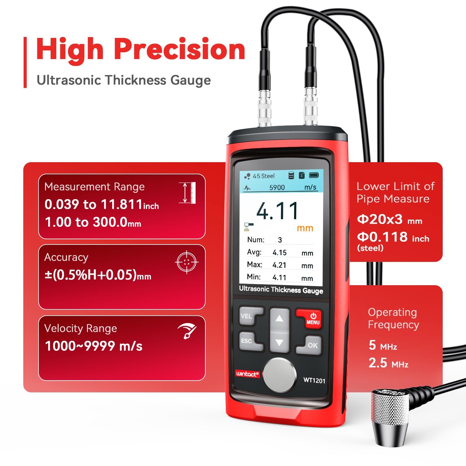 Fast & Accurate: The ultrasonic thickness gauge measuring ranges from 0.039 to 11.81 in/1 to 300mm, Resolution: 0.01mm. you can get accurate (±0.5%H+0.05mm) readings in inch or mm in 0.5 seconds