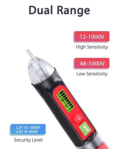• Dual Range (12 -1000 V/48V- 1000V): Press the S button to adjust sensitivity can choose according to your needs to detect voltage on AC electric throughout the home: outlets, cords, switches, circuit breaker, power strip, etc. The NCV sensor automatically recognizes the voltage and displays it on the bar graph.